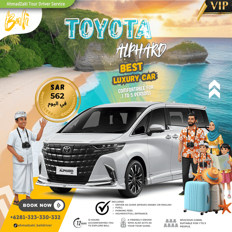 اختبر تجربة VIP في بالي مع تويوتا ألفارد، سيارة فاخرة تتسع لـ 1 إلى 4 أشخاص.