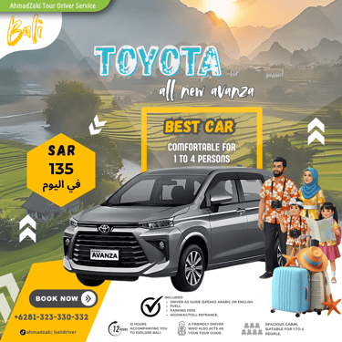 استمتع برحلة مريحة واقتصادية مع تويوتا أفانزا، المثالية لما يصل إلى 4 ركاب بدون أمتعة كبيرة. تتميز بمقصورة نظيفة ومكيّف هواء بارد، مع سائق خاص يتحدث العربية أو الإنجليزية ليأخذك في جولة آمنة ومريحة لاكتشاف جمال بالي.