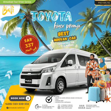 استمتع بتجربة فاخرة في جزيرة بالي مع تويوتا هايس بريمو، الخيار المثالي للعائلات الكبيرة أو المجموعات من 7 إلى 12 راكبًا.تتميز بمقصورة رحبة، ومكيّف هواء قوي، ومقاعد مريحة توفر لك أقصى درجات الراحة أثناء الرحلة. سائقونا يتحدثون العربية والإنجليزية ويقدمون خدمة احترافية لضمان جولة مريحة وآمنة في أجمل وجهات بالي.